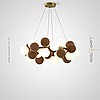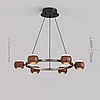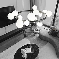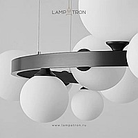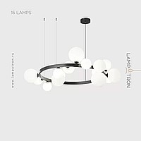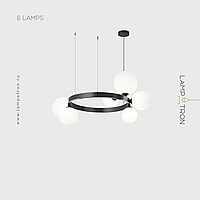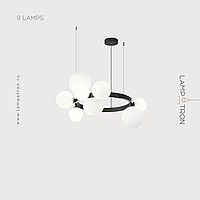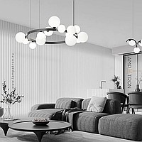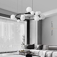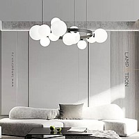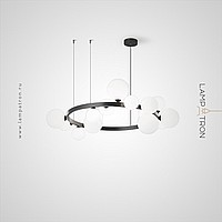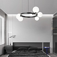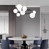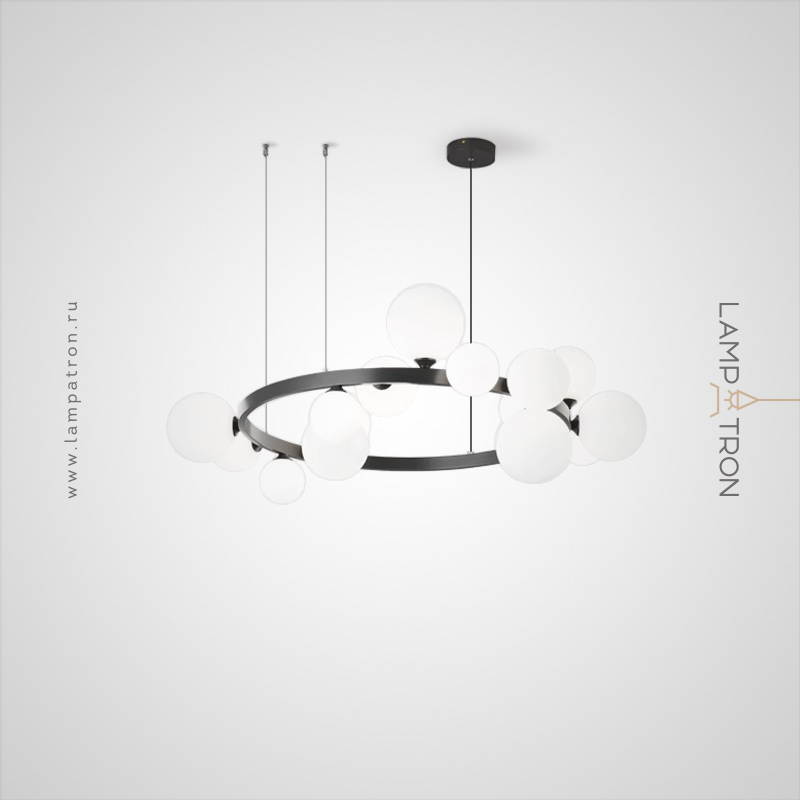 A series of ring chandeliers with asymmetrically arranged white glass shades