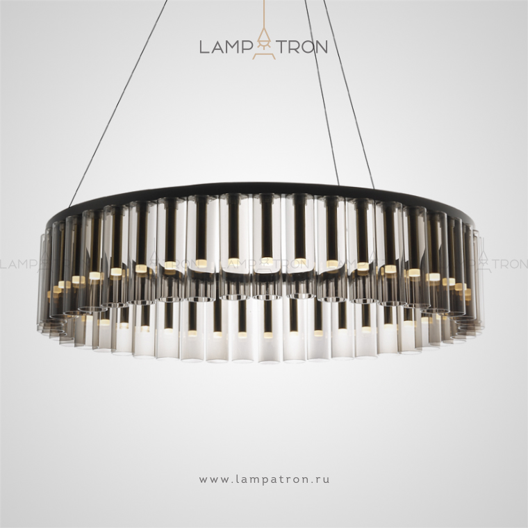 Pendant chandelier in the form of a ring from a series of tinted glass cylinders with LED lamps inside