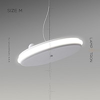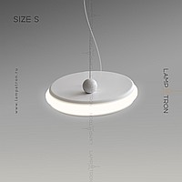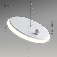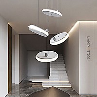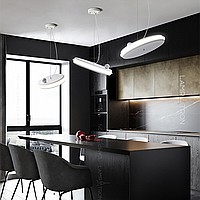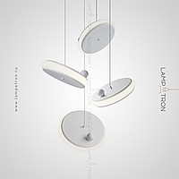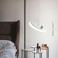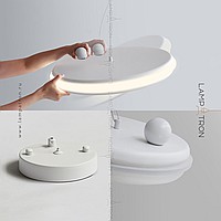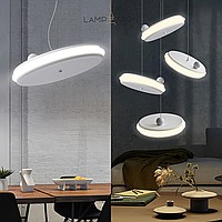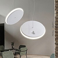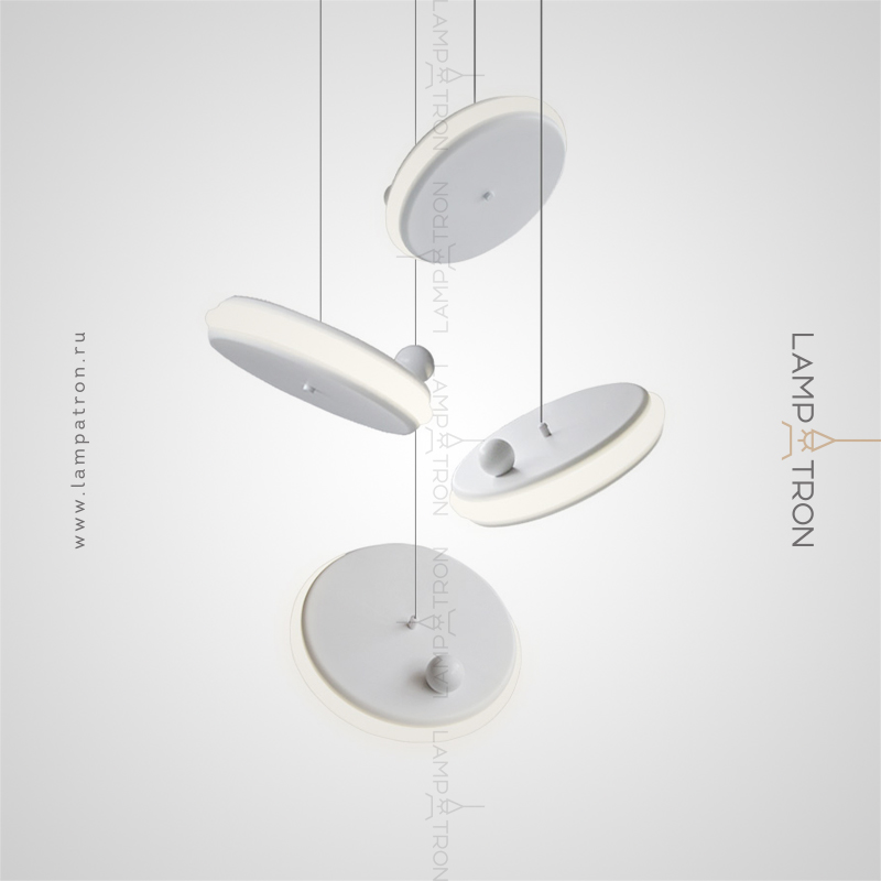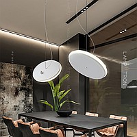 A series of suspended LED lamps in the form of white disks with a side LED lighting and a magnetic ball that regulates the slope of the case