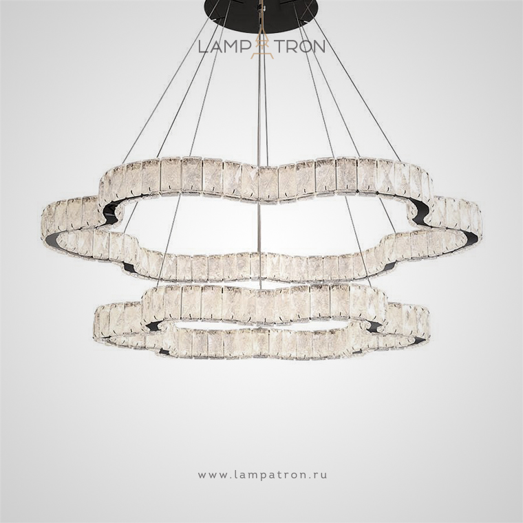 A series of LED chandeliers with crystal plate décor with a frost pattern on a ring body