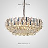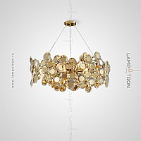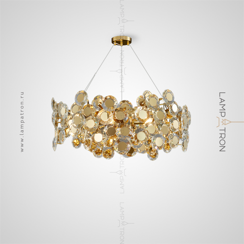A series of designer chandeliers with scattering in the form of crystal medallions with a brass core on a branchy frame