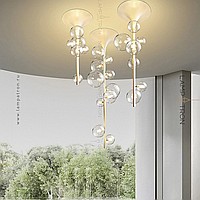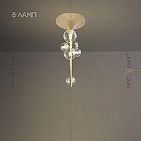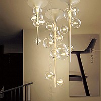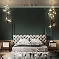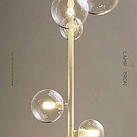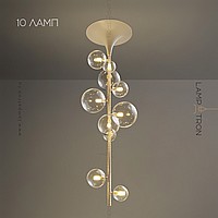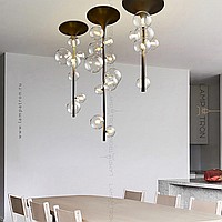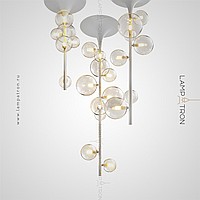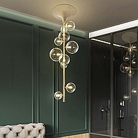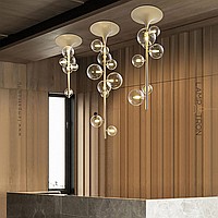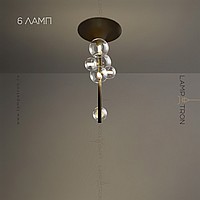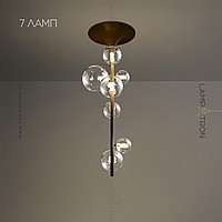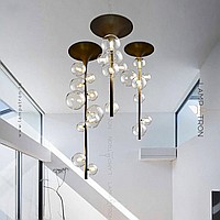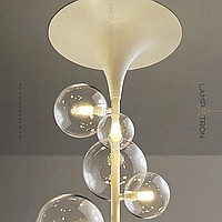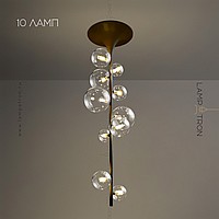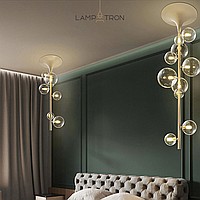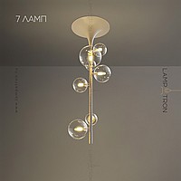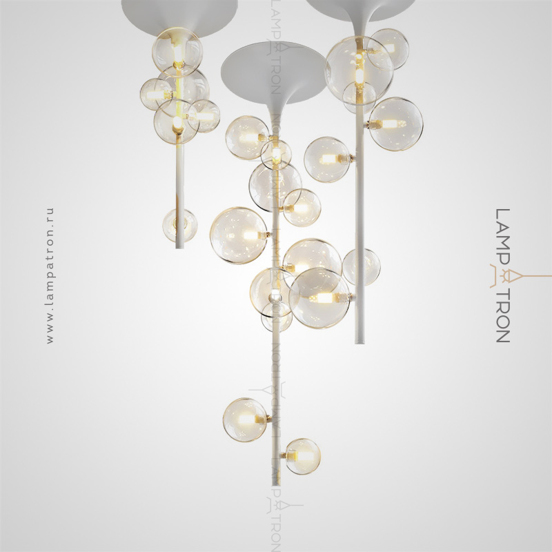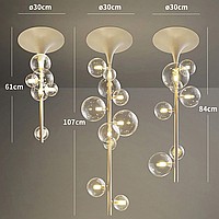 A series of ceiling lamps with transparent spherical ceilings of different sizes on a vertical rack