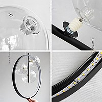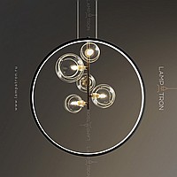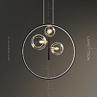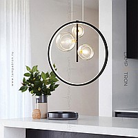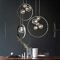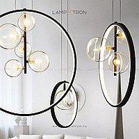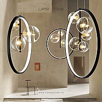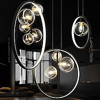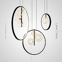 Designer ring chandelier with asymmetrically located glass plafins of different diameters