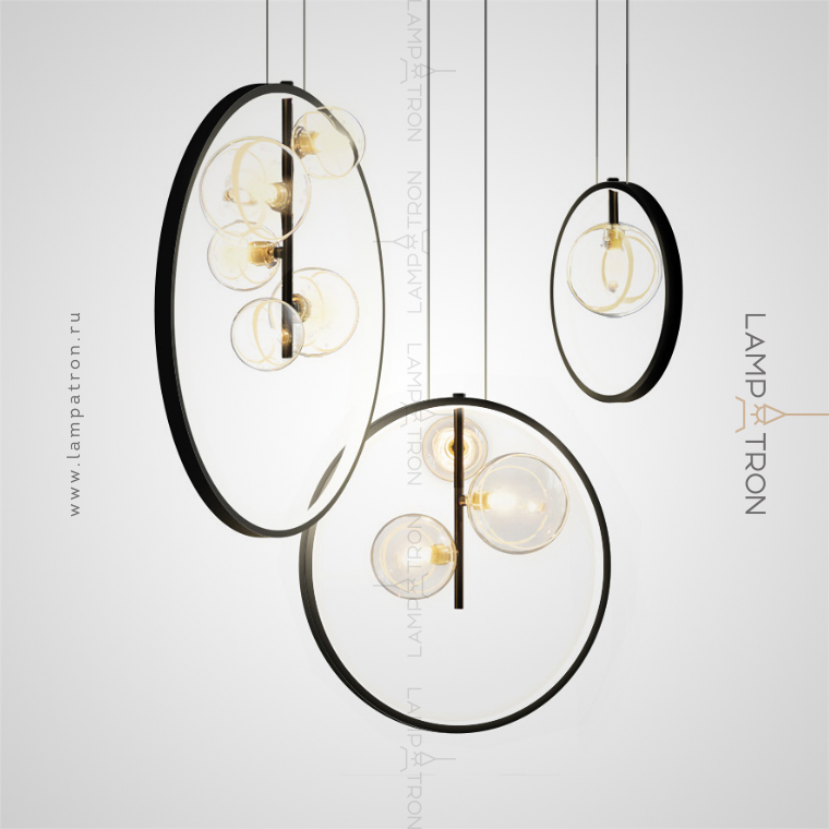 Designer ring chandelier with asymmetrically located glass plafins of different diameters