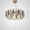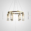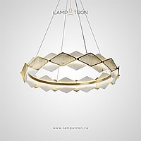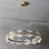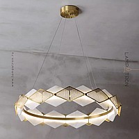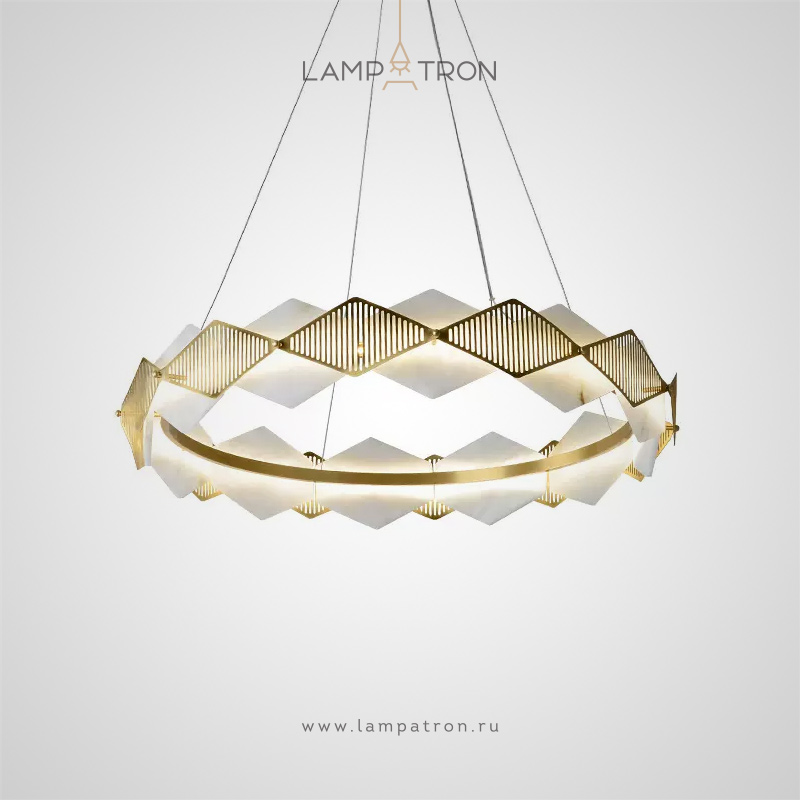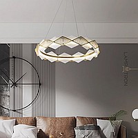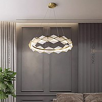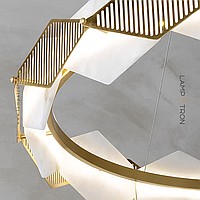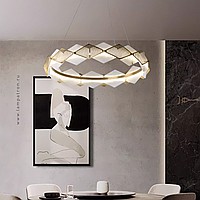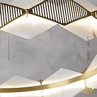 A series of ring chandeliers on a string suspension with a combination of marble diffusers and perforated rhombic plates