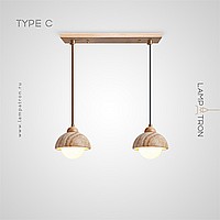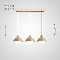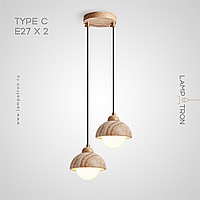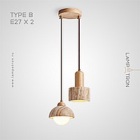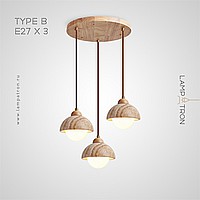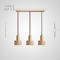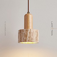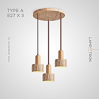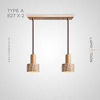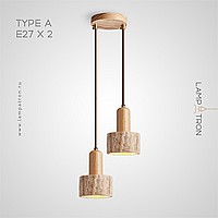 Ready-made combination of pendant lamps with a cylindrical and domed lampshade made of travertine stone with a wooden plinth