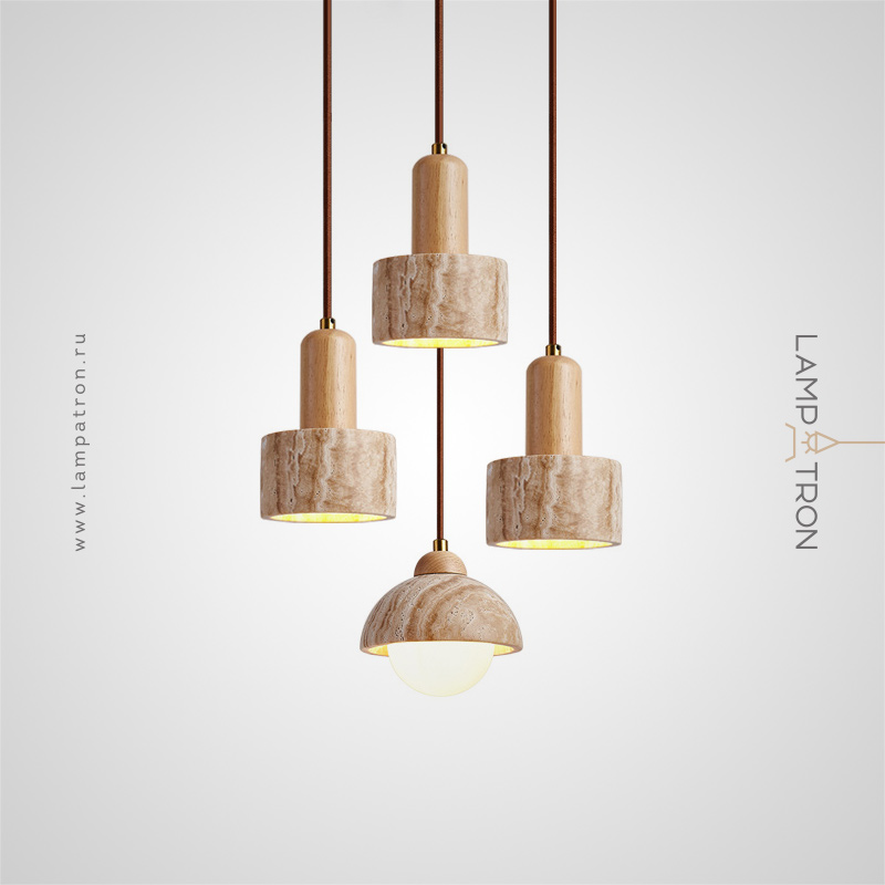 Ready-made combination of pendant lamps with a cylindrical and domed lampshade made of travertine stone with a wooden plinth