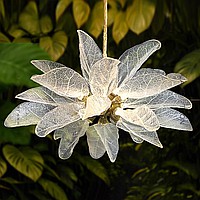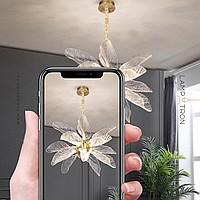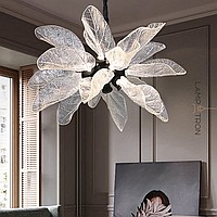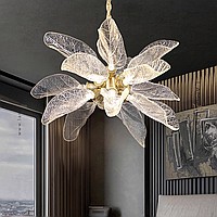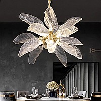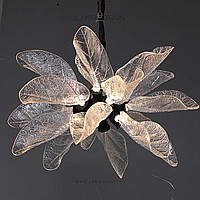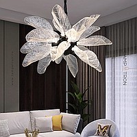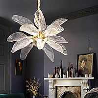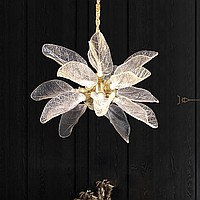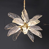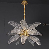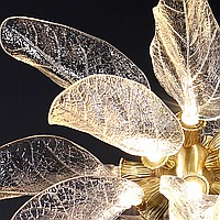 A series of designer chandeliers on a brass frame with transparent leaf-shaped diffusers