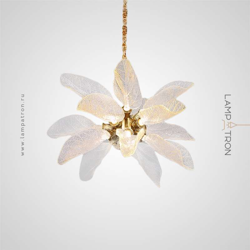 A series of designer chandeliers on a brass frame with transparent leaf-shaped diffusers
