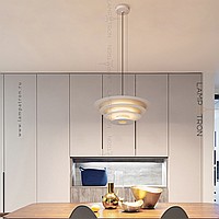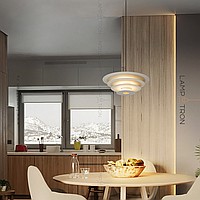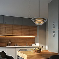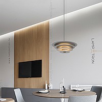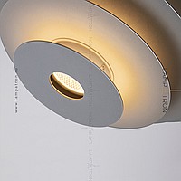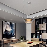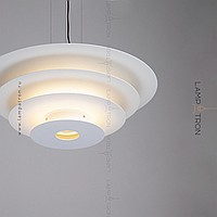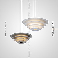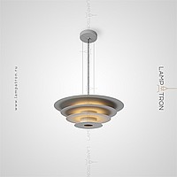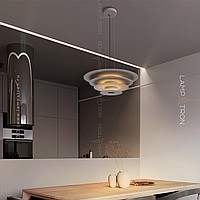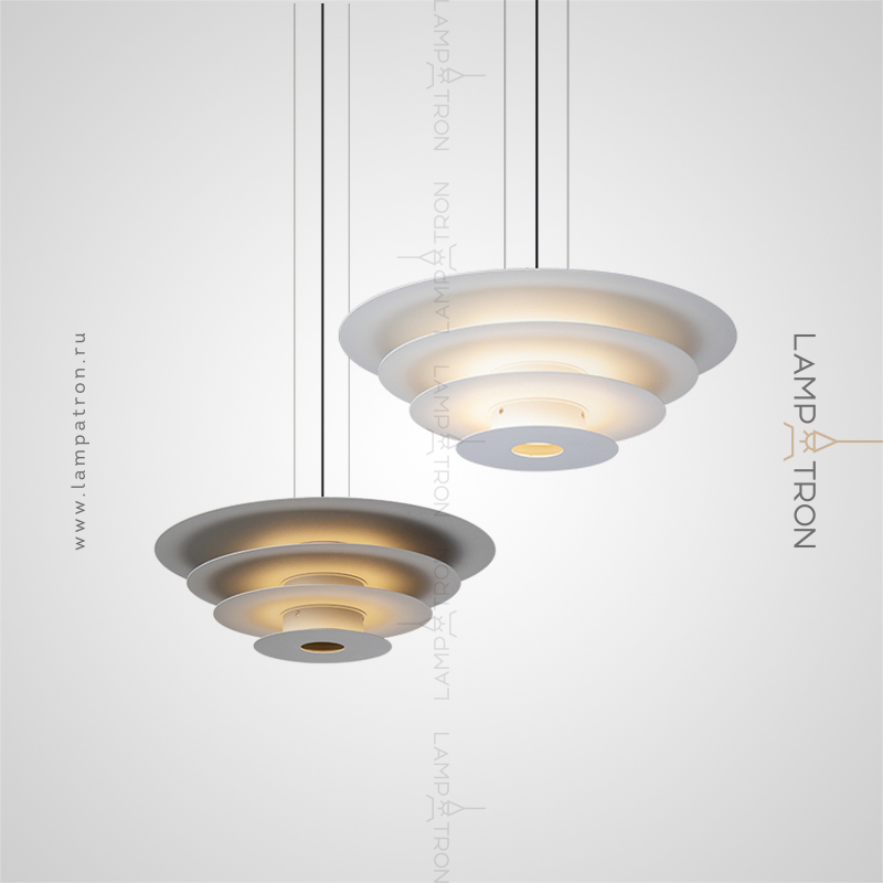 A series of suspended LED lamps with a pyramidal case of metal disks of different diameters