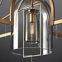 Designer chandelier on a dome frame with double glass ceiling with decorative metal frames and glass pendants on metal rods