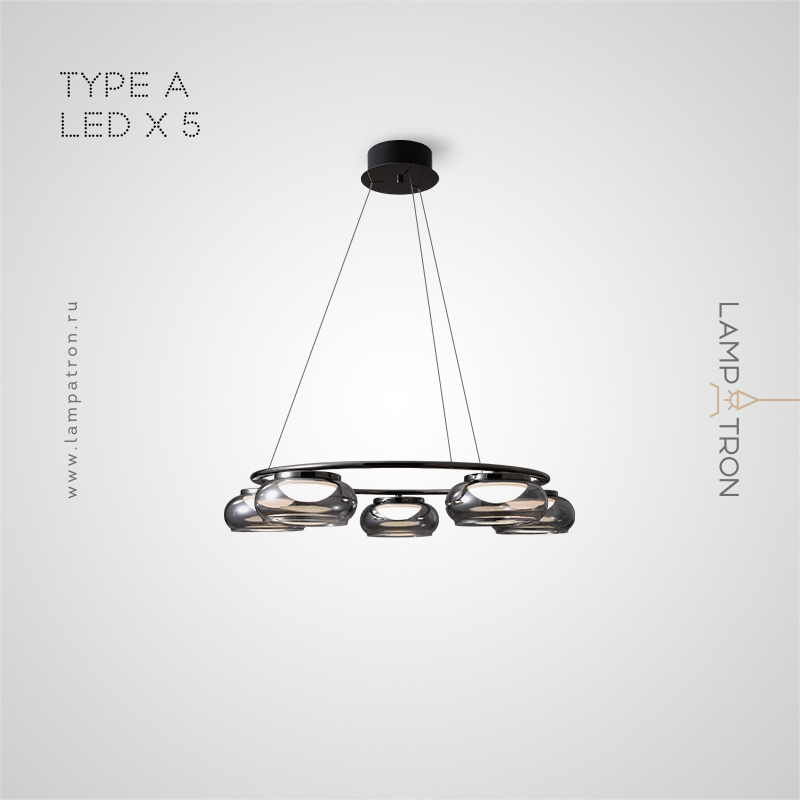 A series of ring chandeliers with hemispherical sources in rounded smoked glass shades