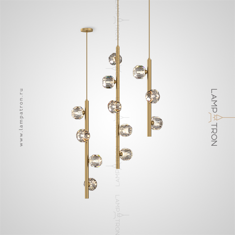 A series of designer lamps with multifaceted crystal ceiling on a brass tubular case