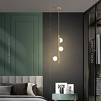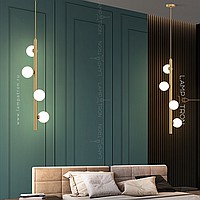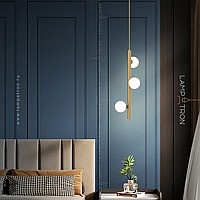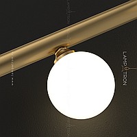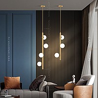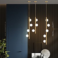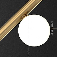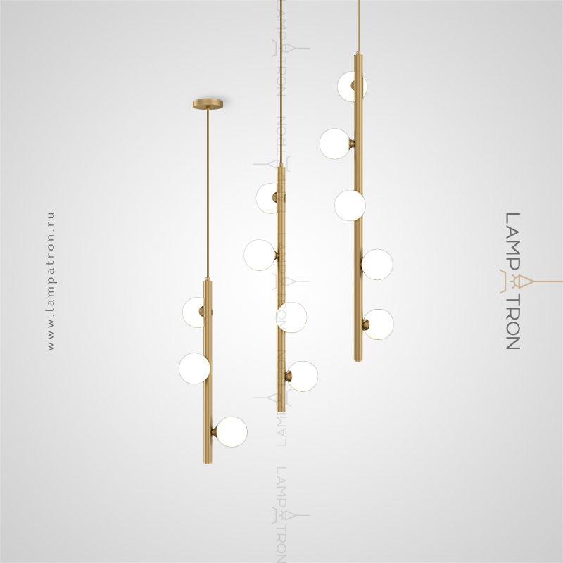 A series of designer lamps with white spherical glasses of glass on a brass tubular case