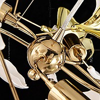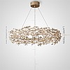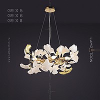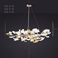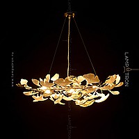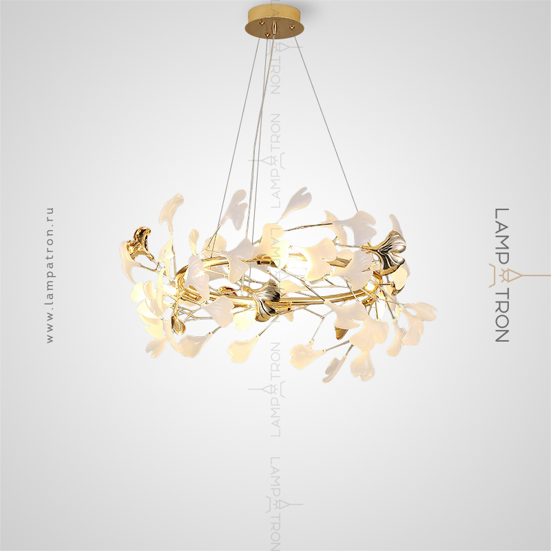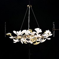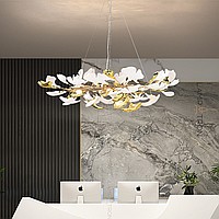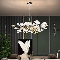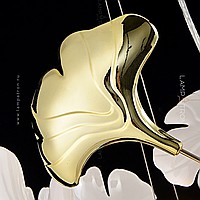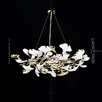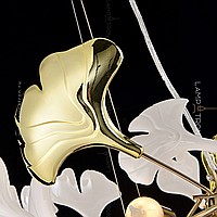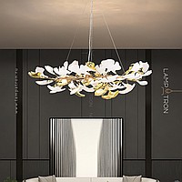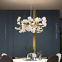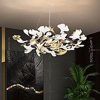 A series of designer chandeliers on a ring frame with white and brass scatters imitating ginkgo leaves