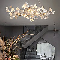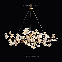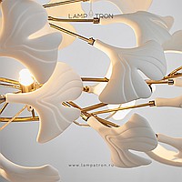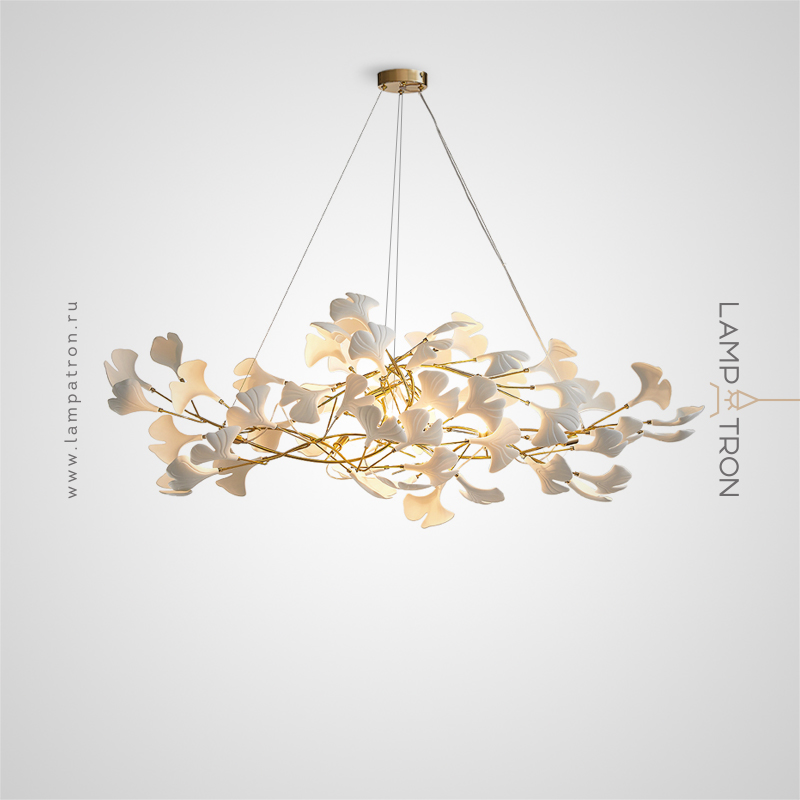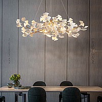 A series of chandeliers with white and brass diffusers on a branching frame with natural motifs