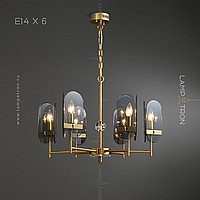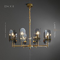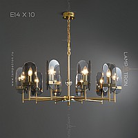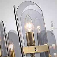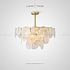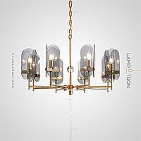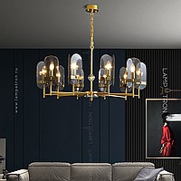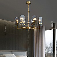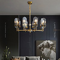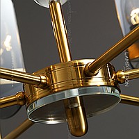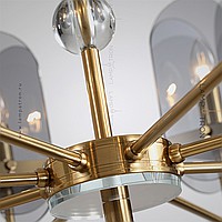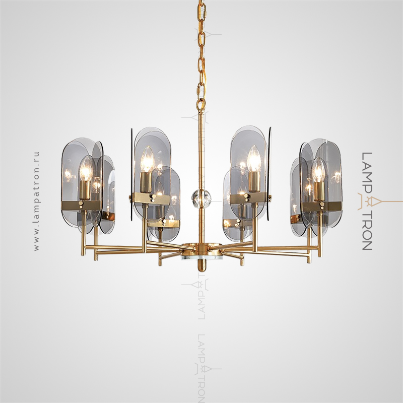 A series of designer chandeliers on a radial frame with triple glass dispersers of an elongated rounded shape