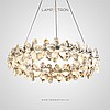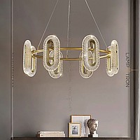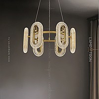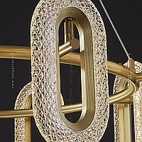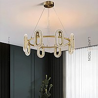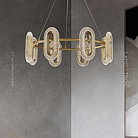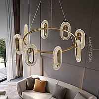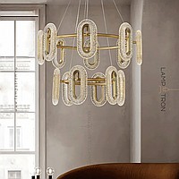 A series of multi -tiered LED chandeliers on a ring frame with ring -shaped relief ceiling