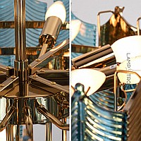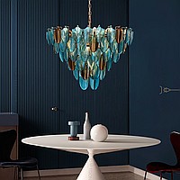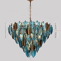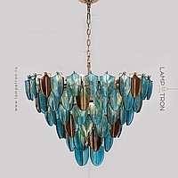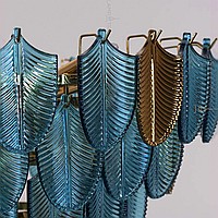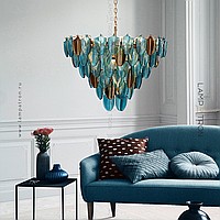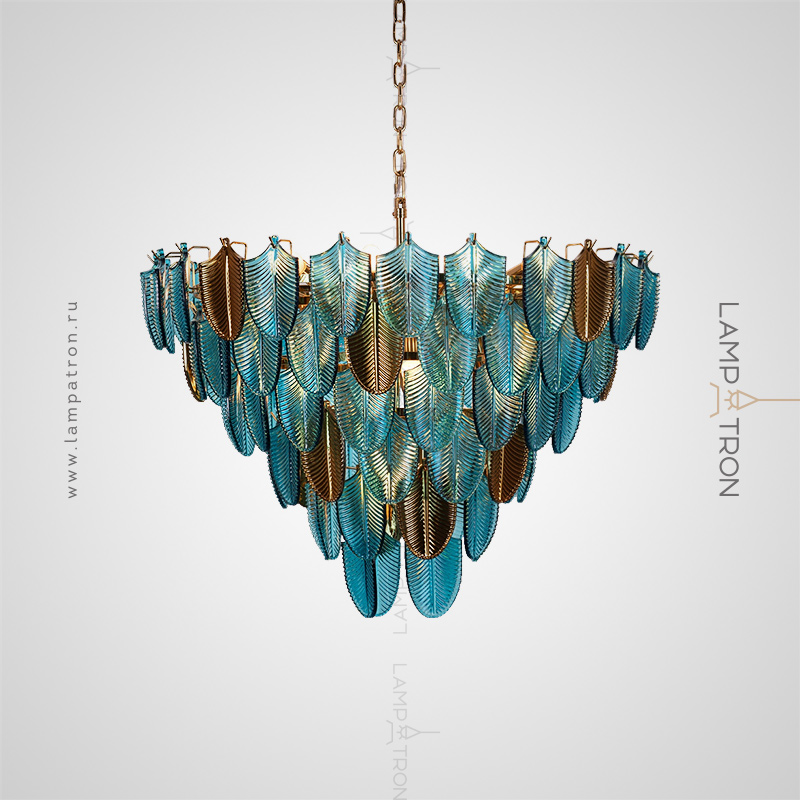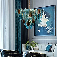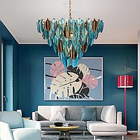 Suspended chandelier with color decor in the form of feathers located with several tiers