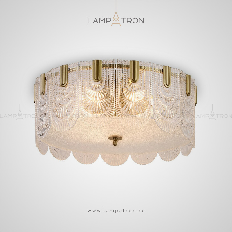 Ceiling chandelier with a lampshade of openwork glass plates of a rounded shape
