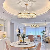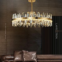 A series of ring LED chandeliers with elongated rounded crystal diffusers