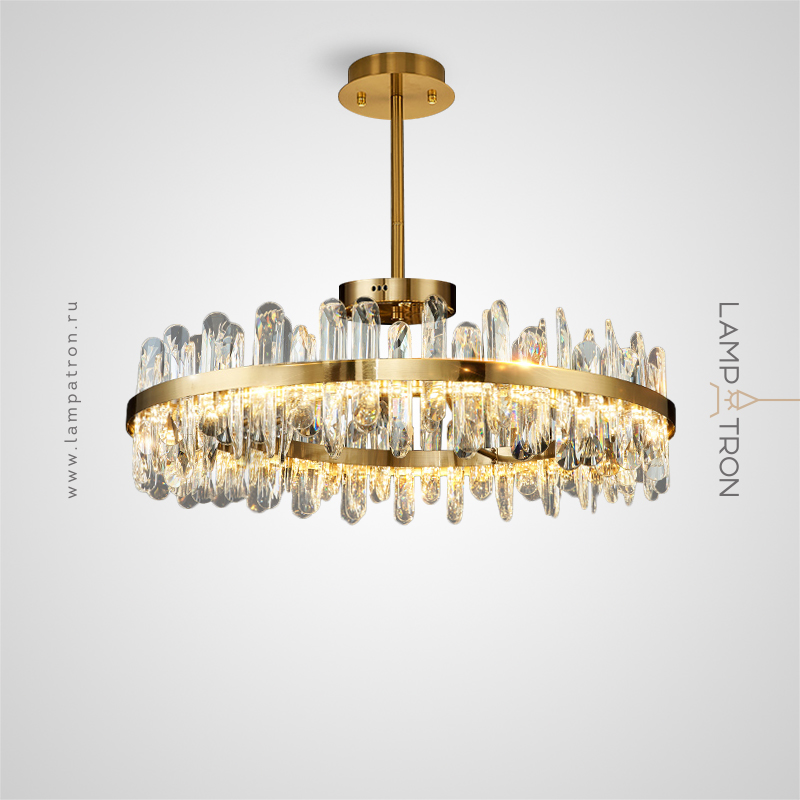 A series of ring LED chandeliers with elongated rounded crystal diffusers