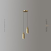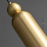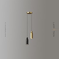 Paired combination of pendant LED lamps in a modern style with a cylindrical body and a spherical clip made of natural and blackened brass