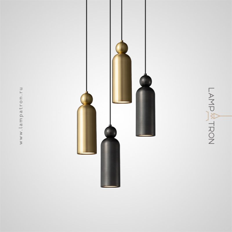 Paired combination of pendant LED lamps in a modern style with a cylindrical body and a spherical clip made of natural and blackened brass
