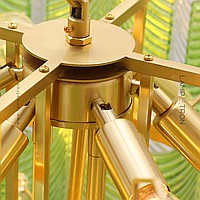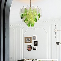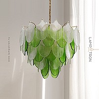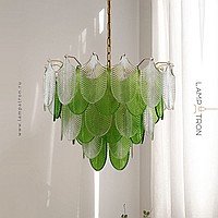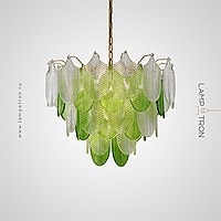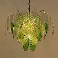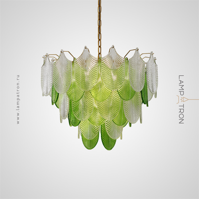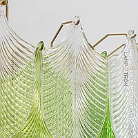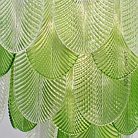 Cascading chandelier with embossed diffusers in the form of green glass feathers