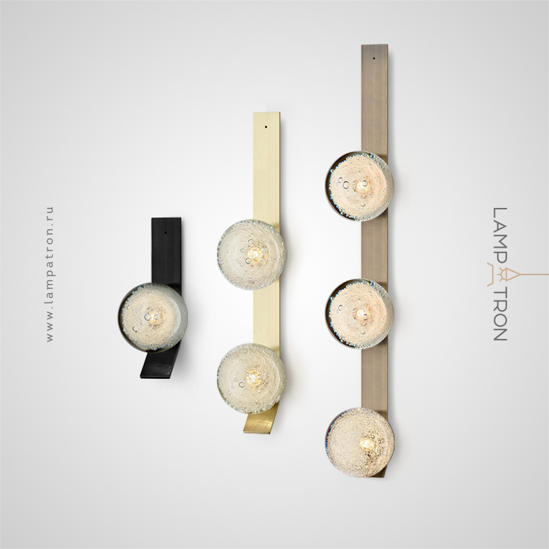 A series of LED sconces on a rectangular mount with spherical diffusers made of glass with an air bubble effect