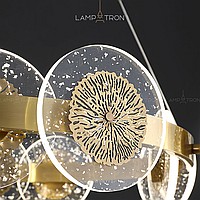 A series of ring chandeliers with round flat diffusers with a decorative element of metal in the center
