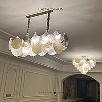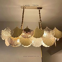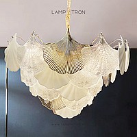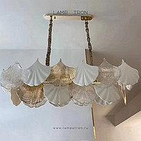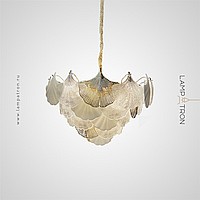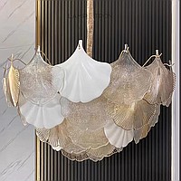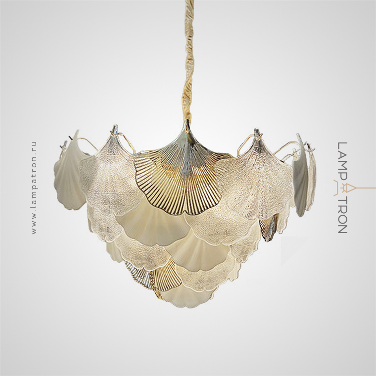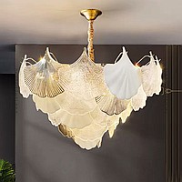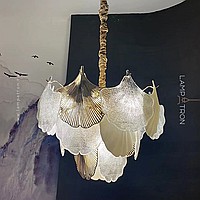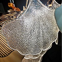 A series of chandeliers with a multi-tiered lampshade made of ginkgo leaf pendants in frosted and transparent glass and metal