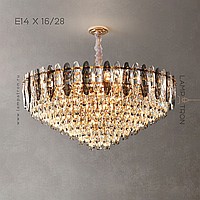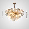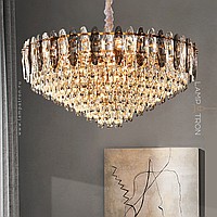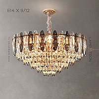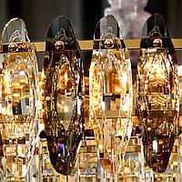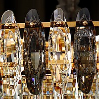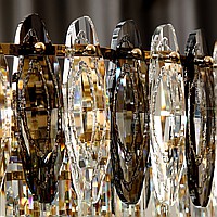 A series of cascading chandeliers with almond-shaped diffusers made of transparent and smoky crystal