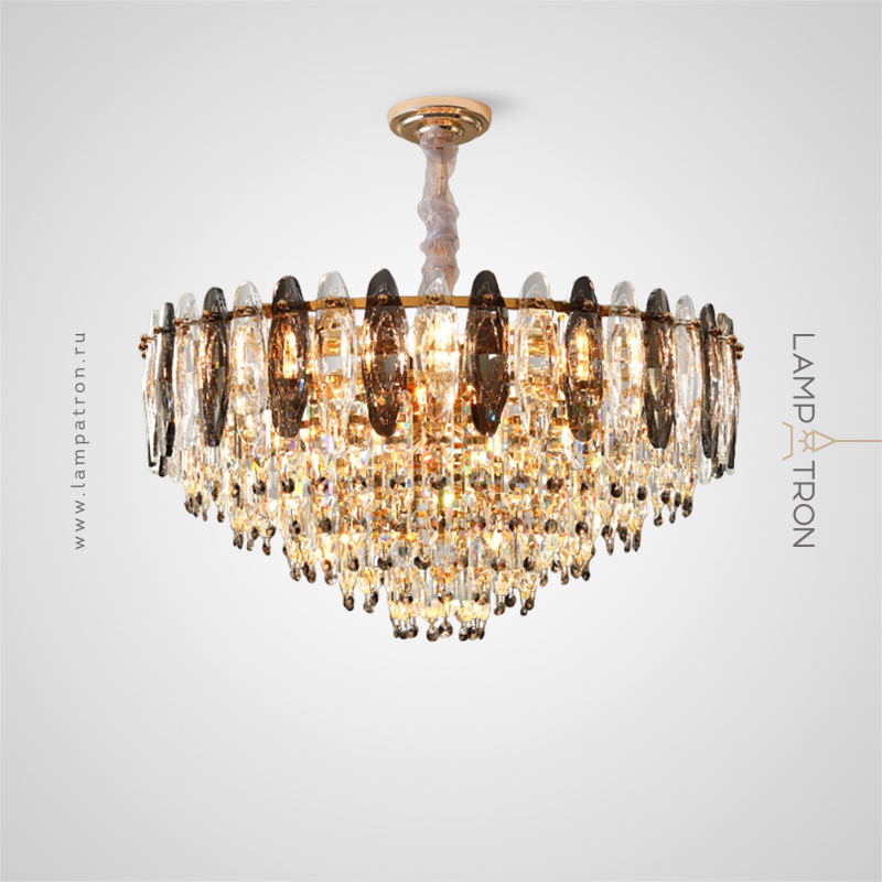 A series of cascading chandeliers with almond-shaped diffusers made of transparent and smoky crystal