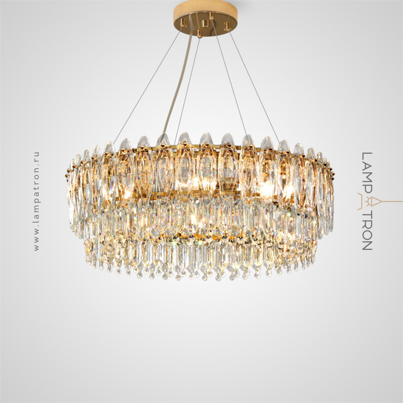 A series of cascading chandeliers on an annular body with almond-shaped diffusers made of K9 crystal