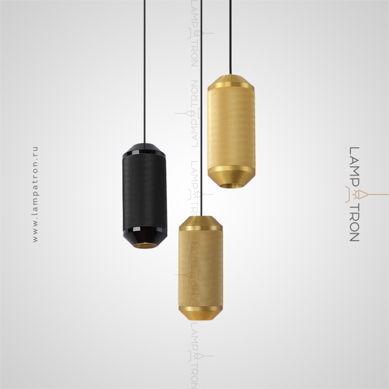 A series of suspended LED lamps with a cylindrical ceiling with a mesh relief and glossy rim