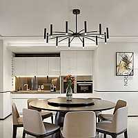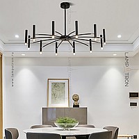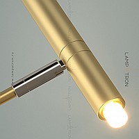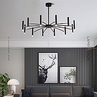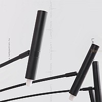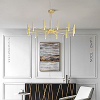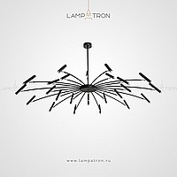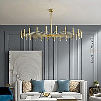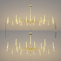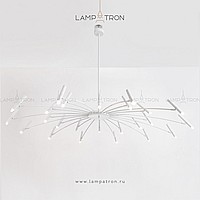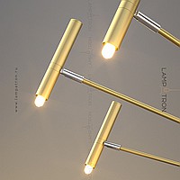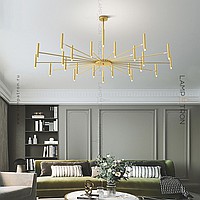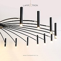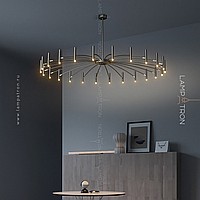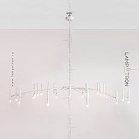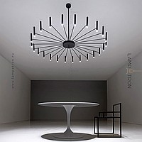 A series of designer chandeliers on a radial frame with thin cylindrical lamplines