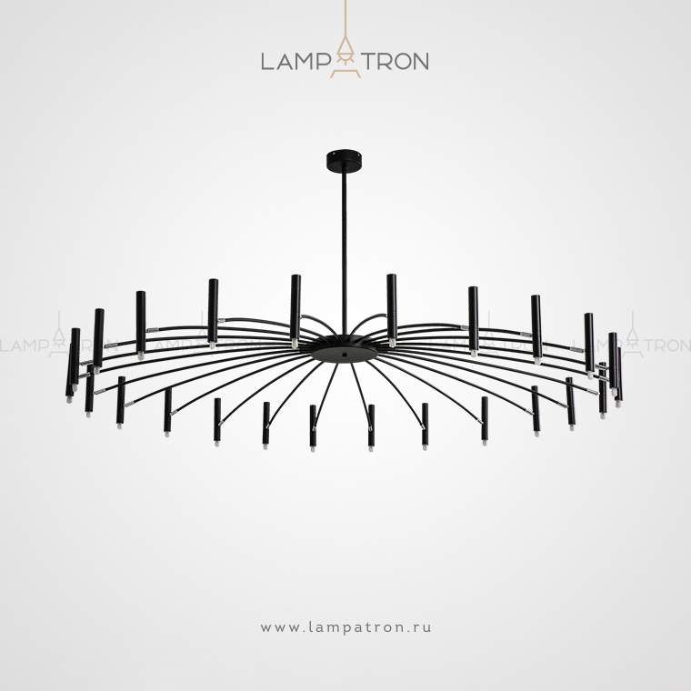 A series of designer chandeliers on a radial frame with thin cylindrical lamplines