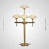 A table lamp with a conical plafon on an inclined rack with a corner stand of a brass tint