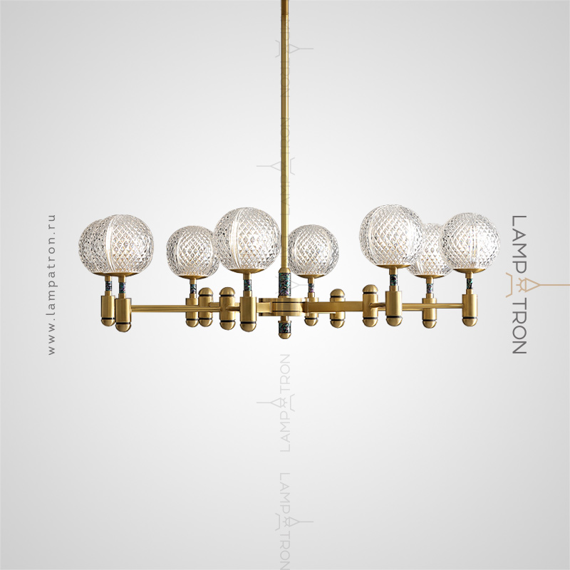 A series of chandeliers on a radial frame with embossed spherical ceiling glasses on glasses with mother -of -pearl trim