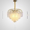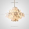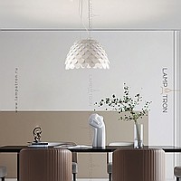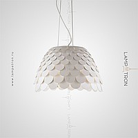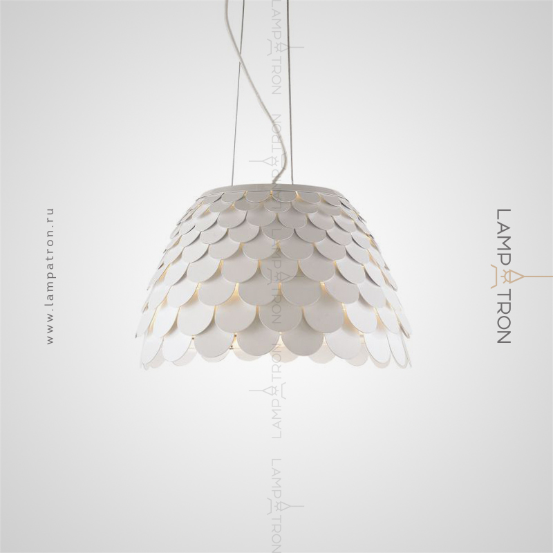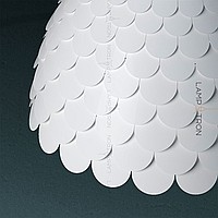 Designer chandelier on string suspension with a dome lampshade of white metal disks