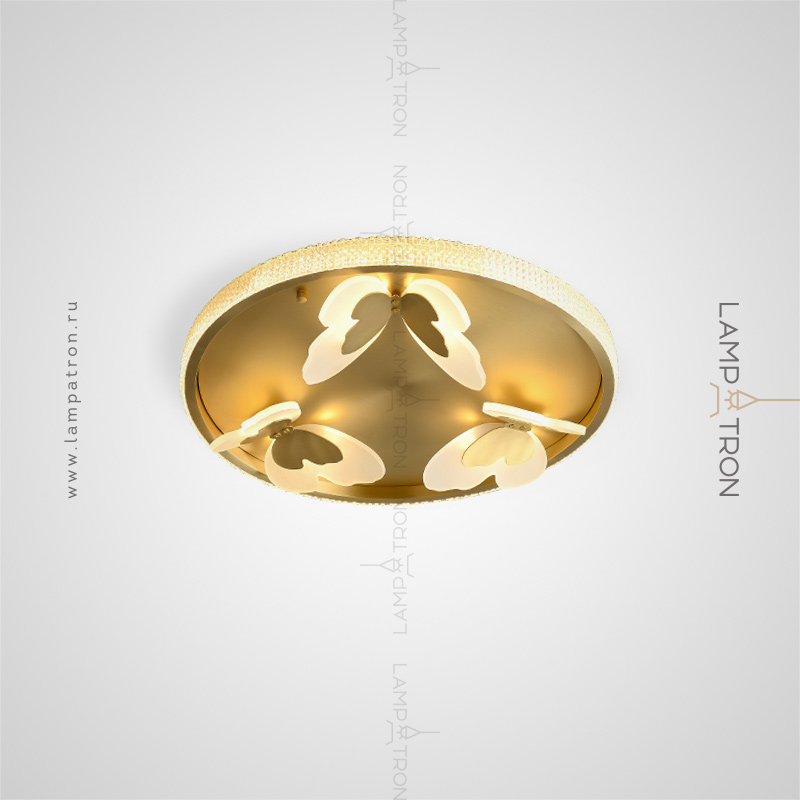 A series of ceiling lamps with decorative luminous butterflies on a disk-shaped base with LED lighting along the contour