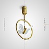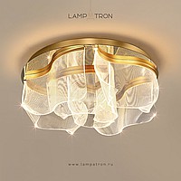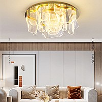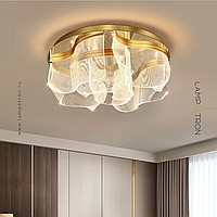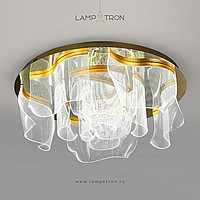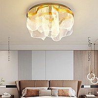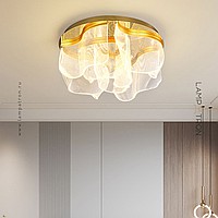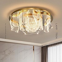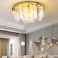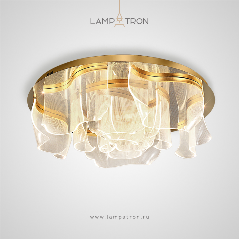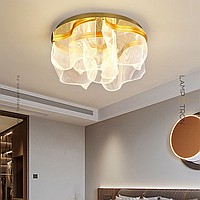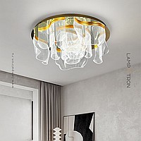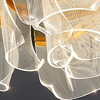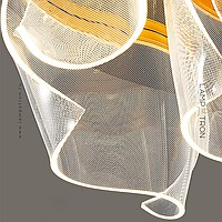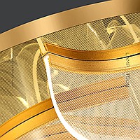 A series of ceiling LED chandeliers with transparent perforated shades in the form of curved plates