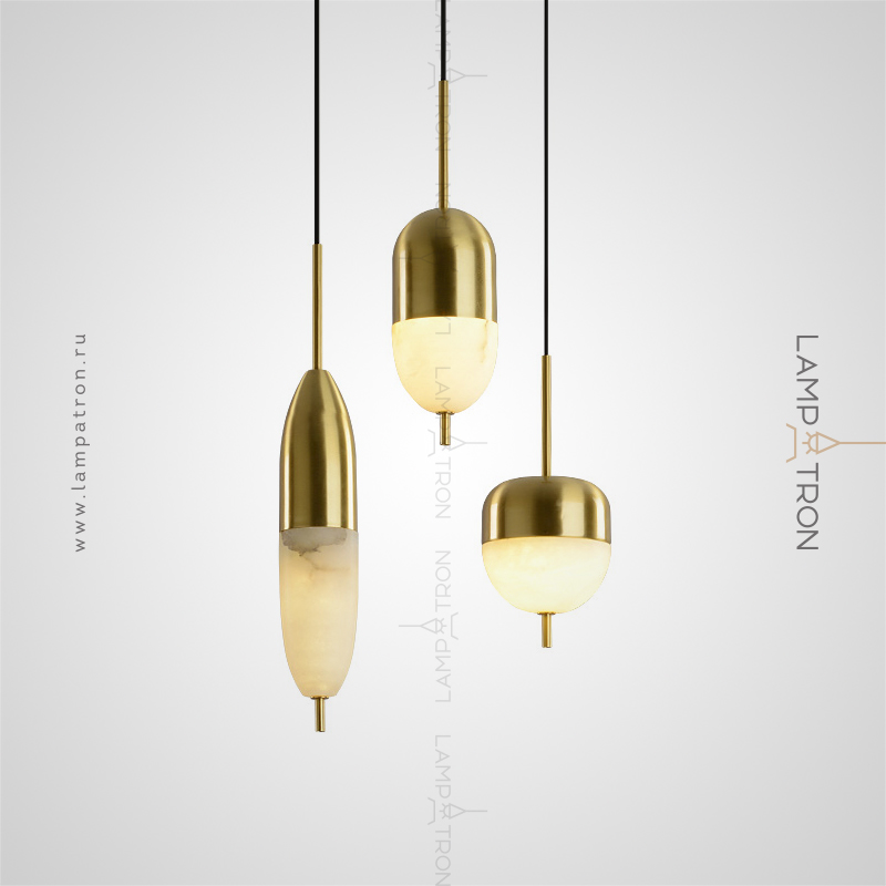 A series of suspended LED lamps with rounded plafins made of natural white marble