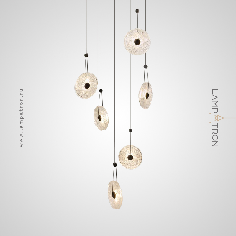 Ready-made combination of LED pendant luminaires with disc-shaped diffusers made of handmade embossed glass