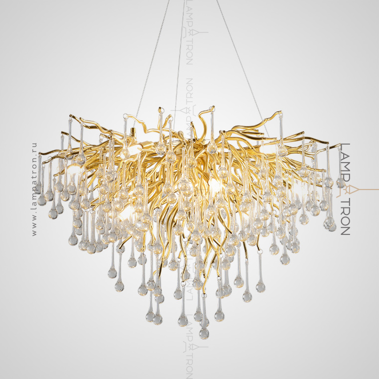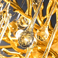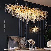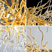 A series of modern chandeliers on a metal frame with transparent glass pendants in the form of drops