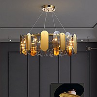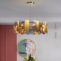 A series of chandeliers on a ring frame with lampshades made of metal and glass plates of a rounded shape