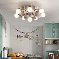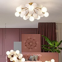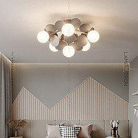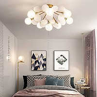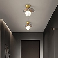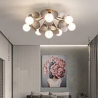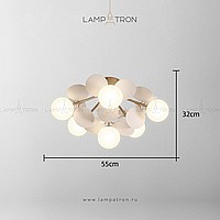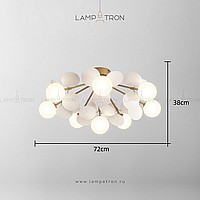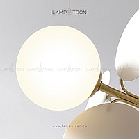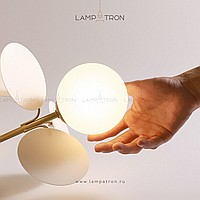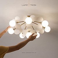 Ceiling chandelier in a modern style with spherical matte ceiling and decor in the form of disks