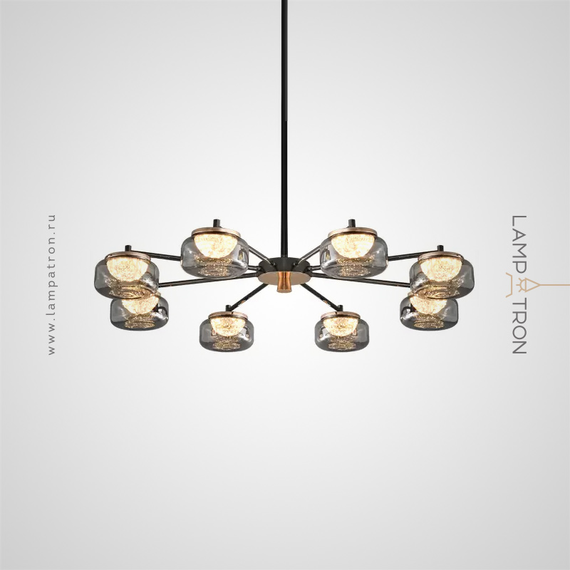 A series of chandeliers with LED light sources in hemispherical diffusers with an ice effect inside glass shades