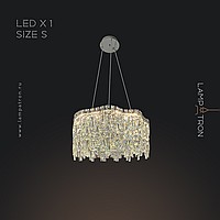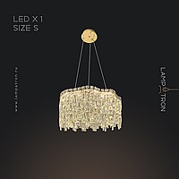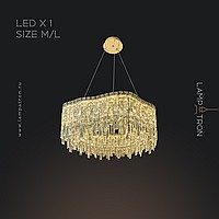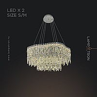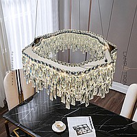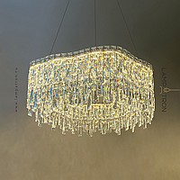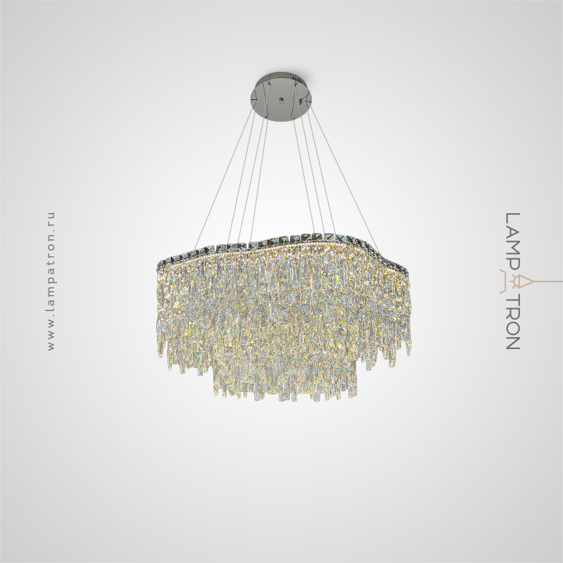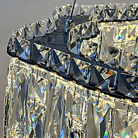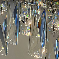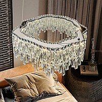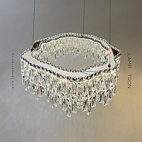 A series of LED chandeliers with rectangular crystal pendants on an irregularly shaped looped body